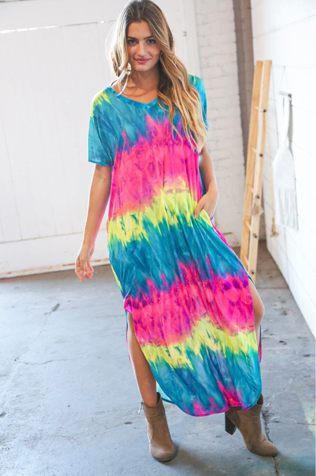 Fall in love with this vibrant multi color tie dye short sleeve maxi dress with side slits and pockets. With a trendy rounded hemline, this silky knit dress is perfect over sandals, heels or boots.