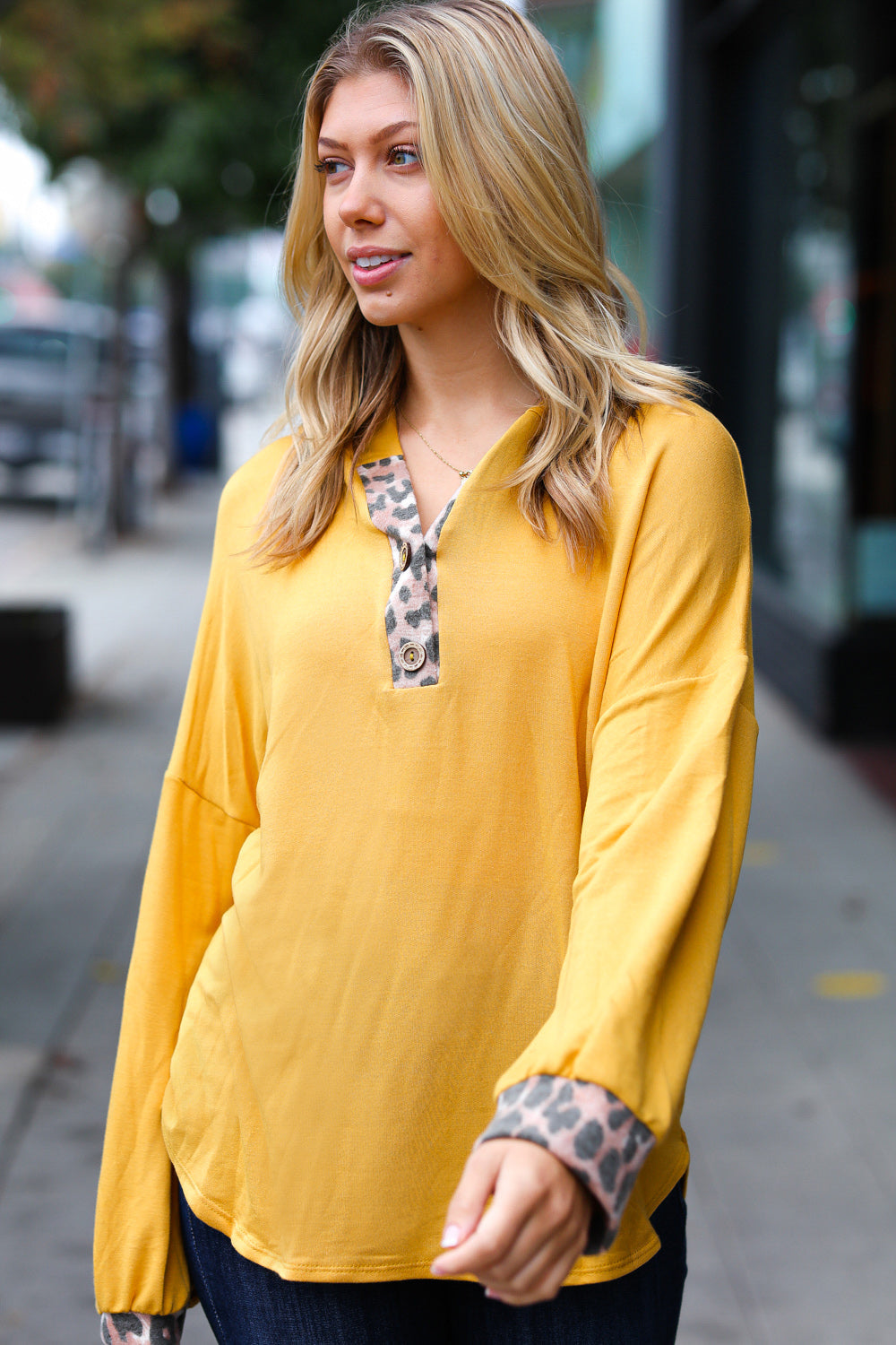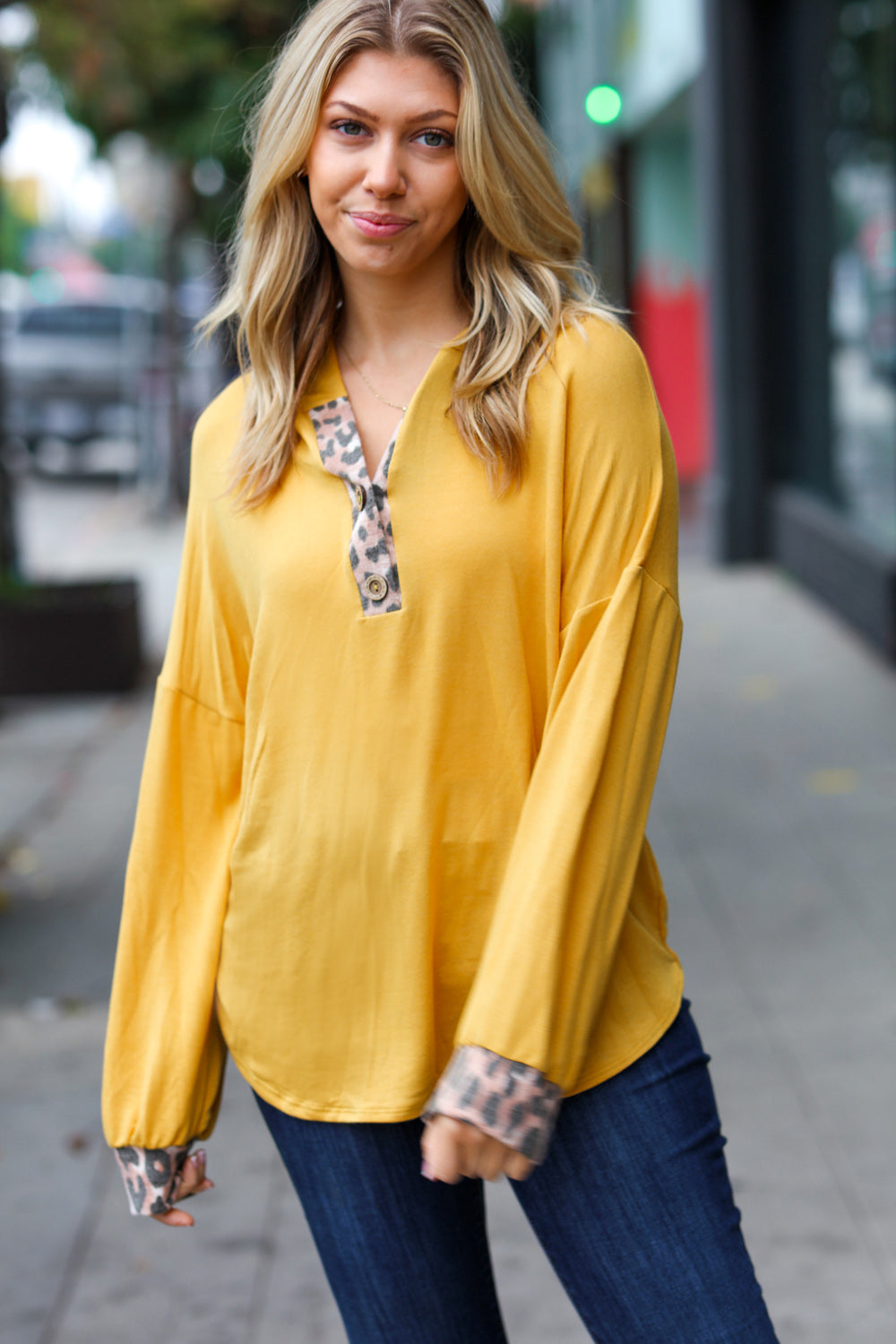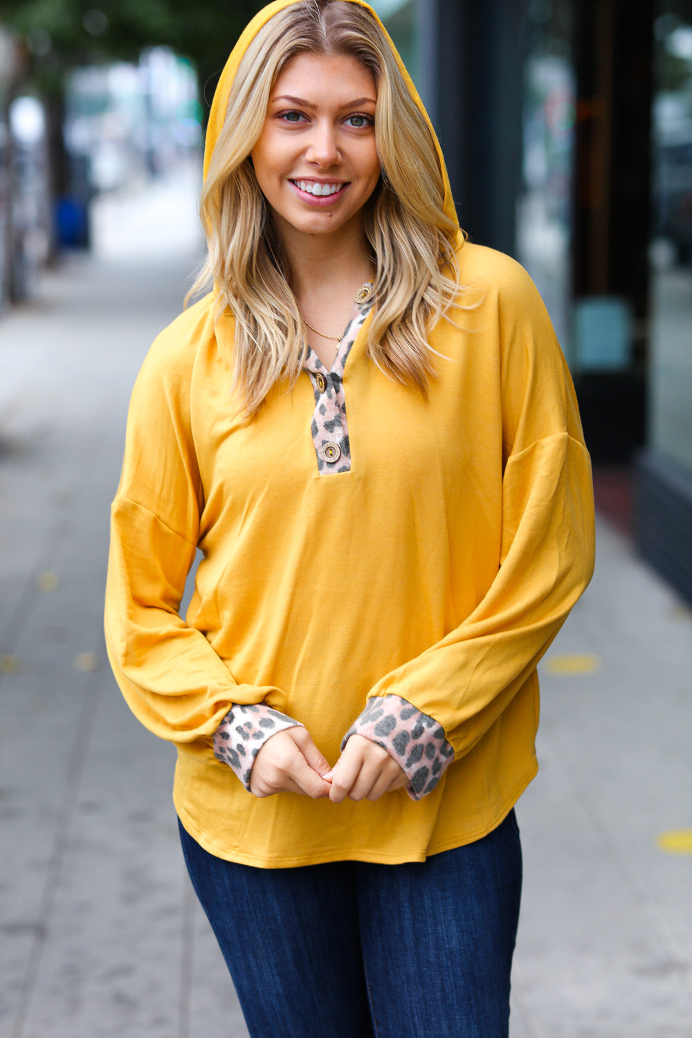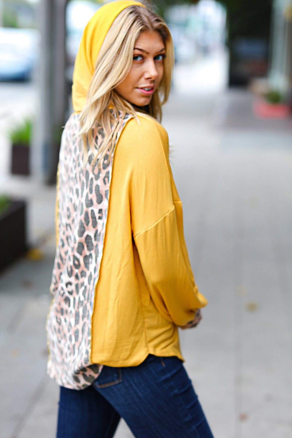 Mustard Leopard Print Button Placard Terry Oversized Hoodie