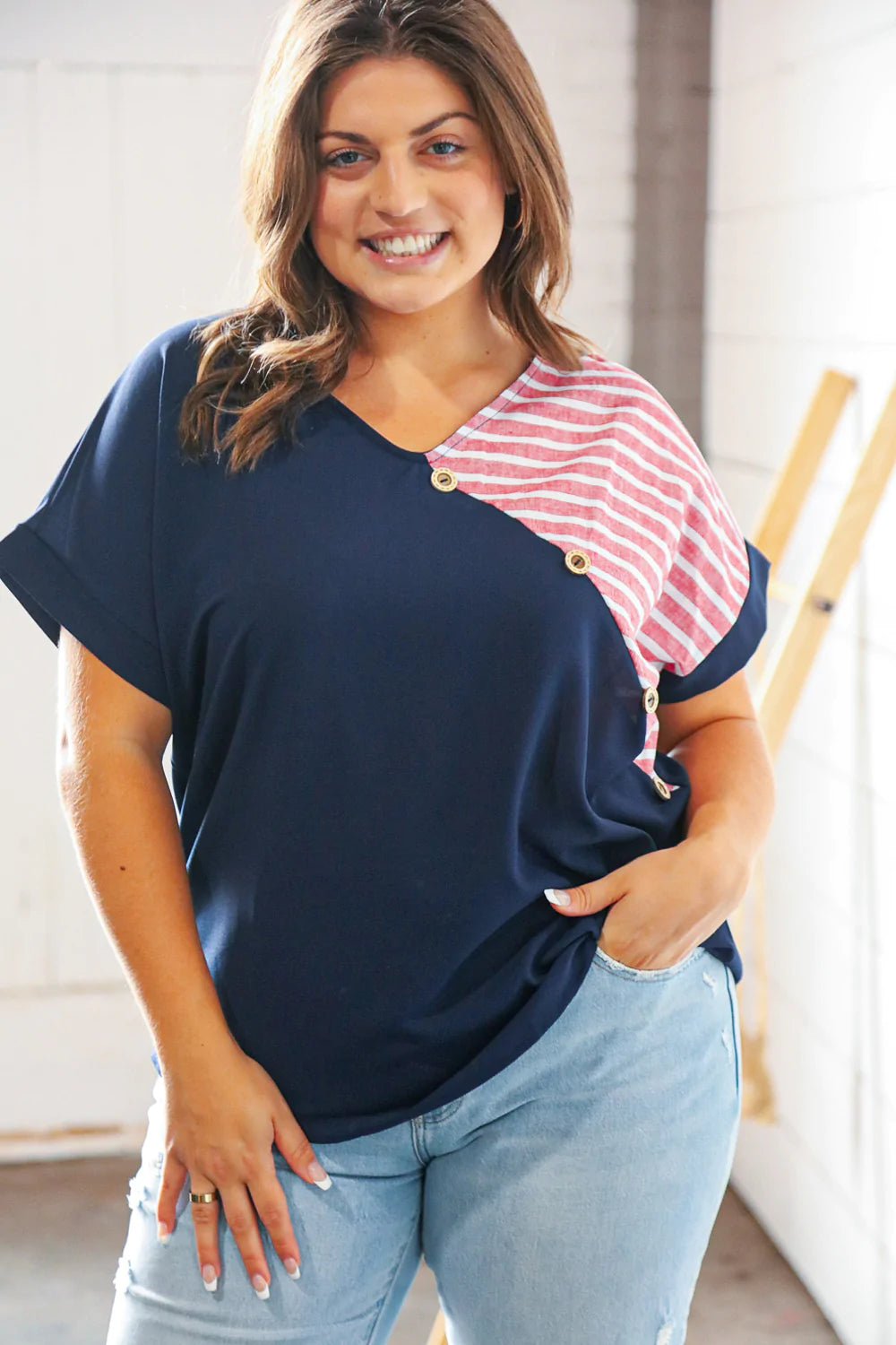 NAVY & RED STRIPE BUTTON V NECK DOLMAN SLEEVE TOP