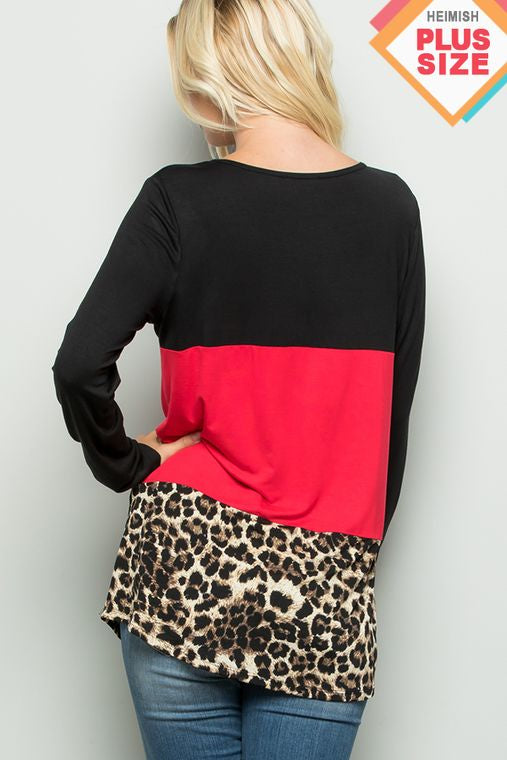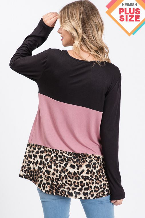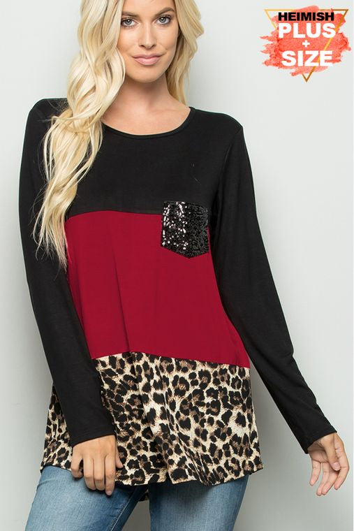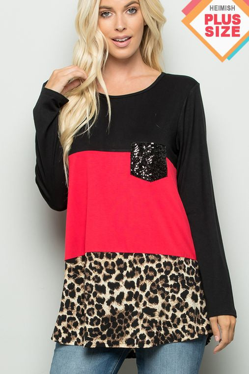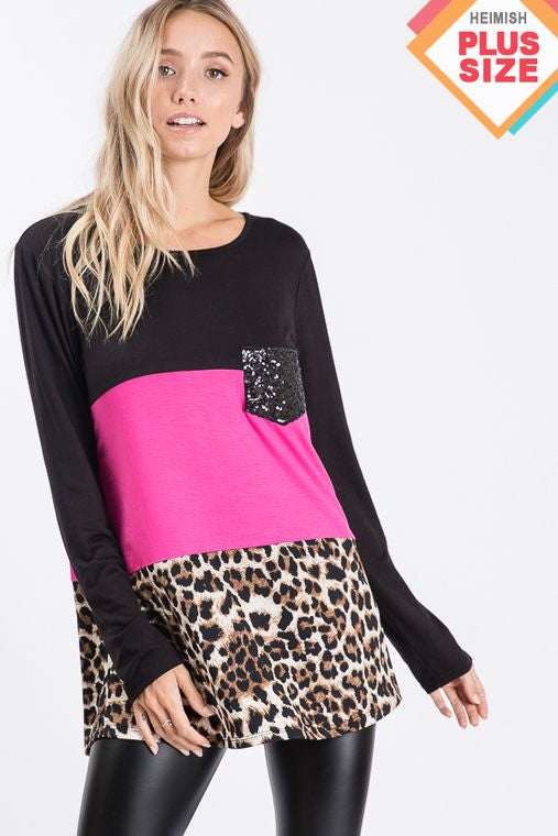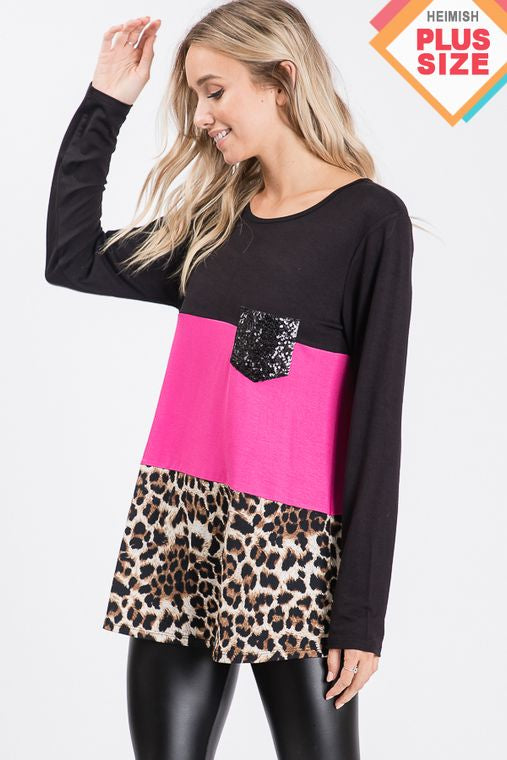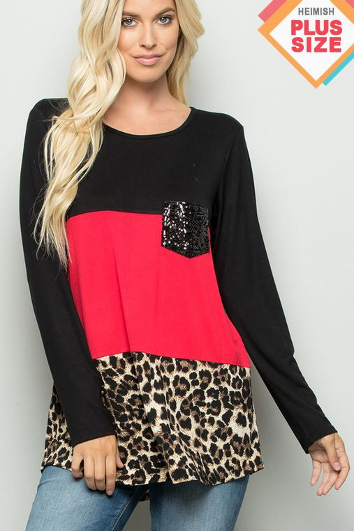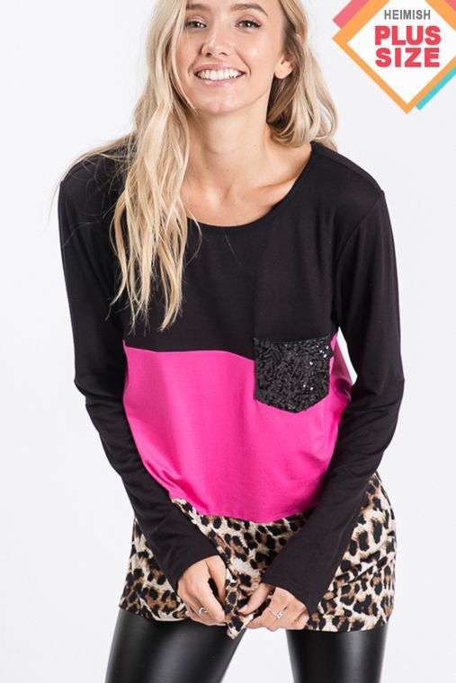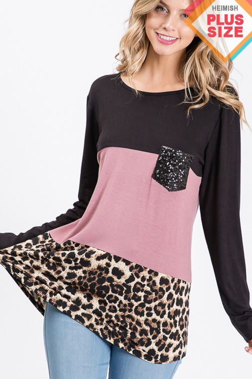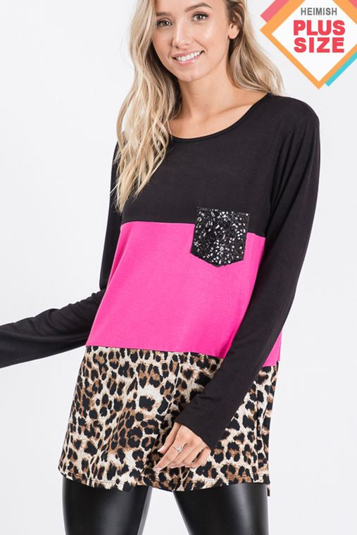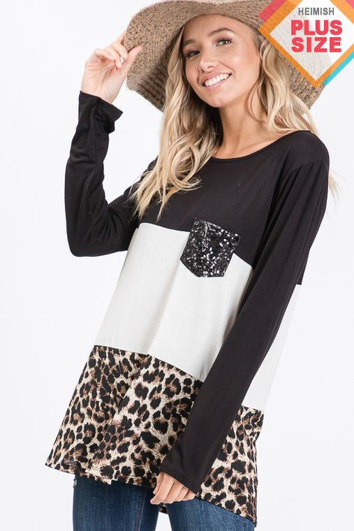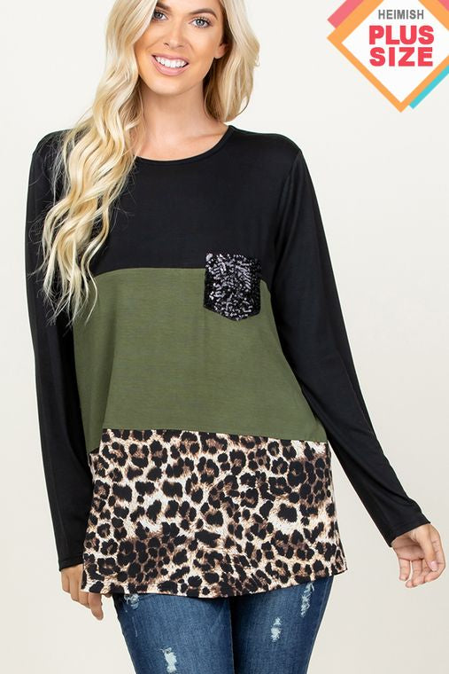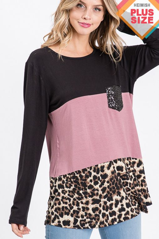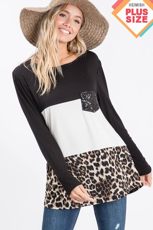 LONG SLEEVE ROUND NECK SOLID AND ANIMAL LEOPARD PRINT CONTRAST TOP WITH BLACK SEQUINS POCKET DETAIL PLUS SIZE