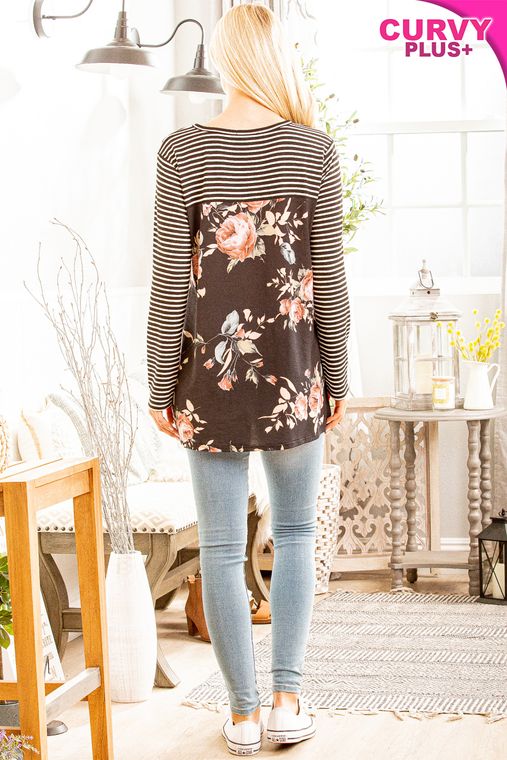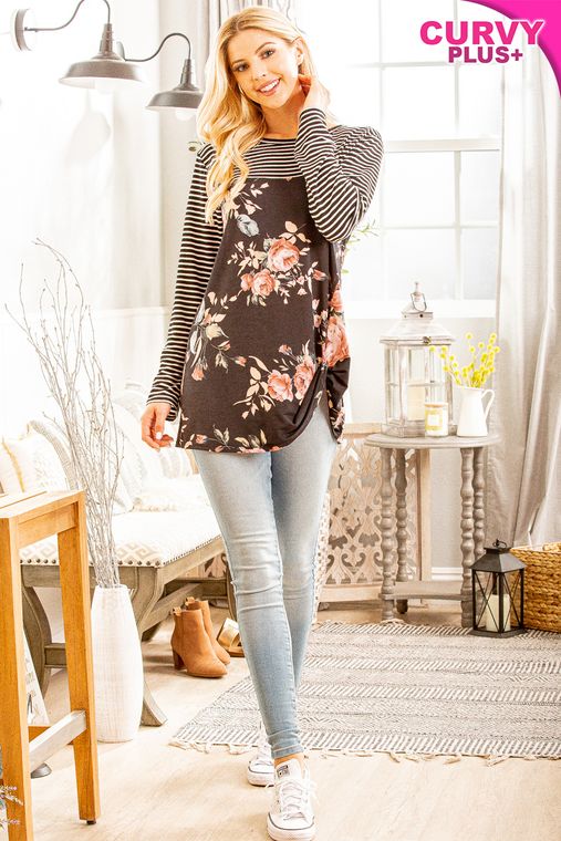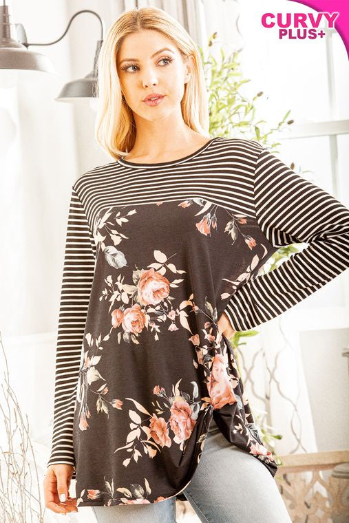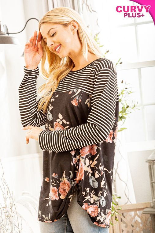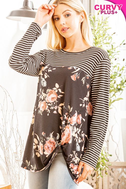 LONG SLEEVE ROUND NECK STRIPE AND FLORAL PRINT CONTRAST TOP WITH TWIST KNOT DETAIL PLUS SIZE