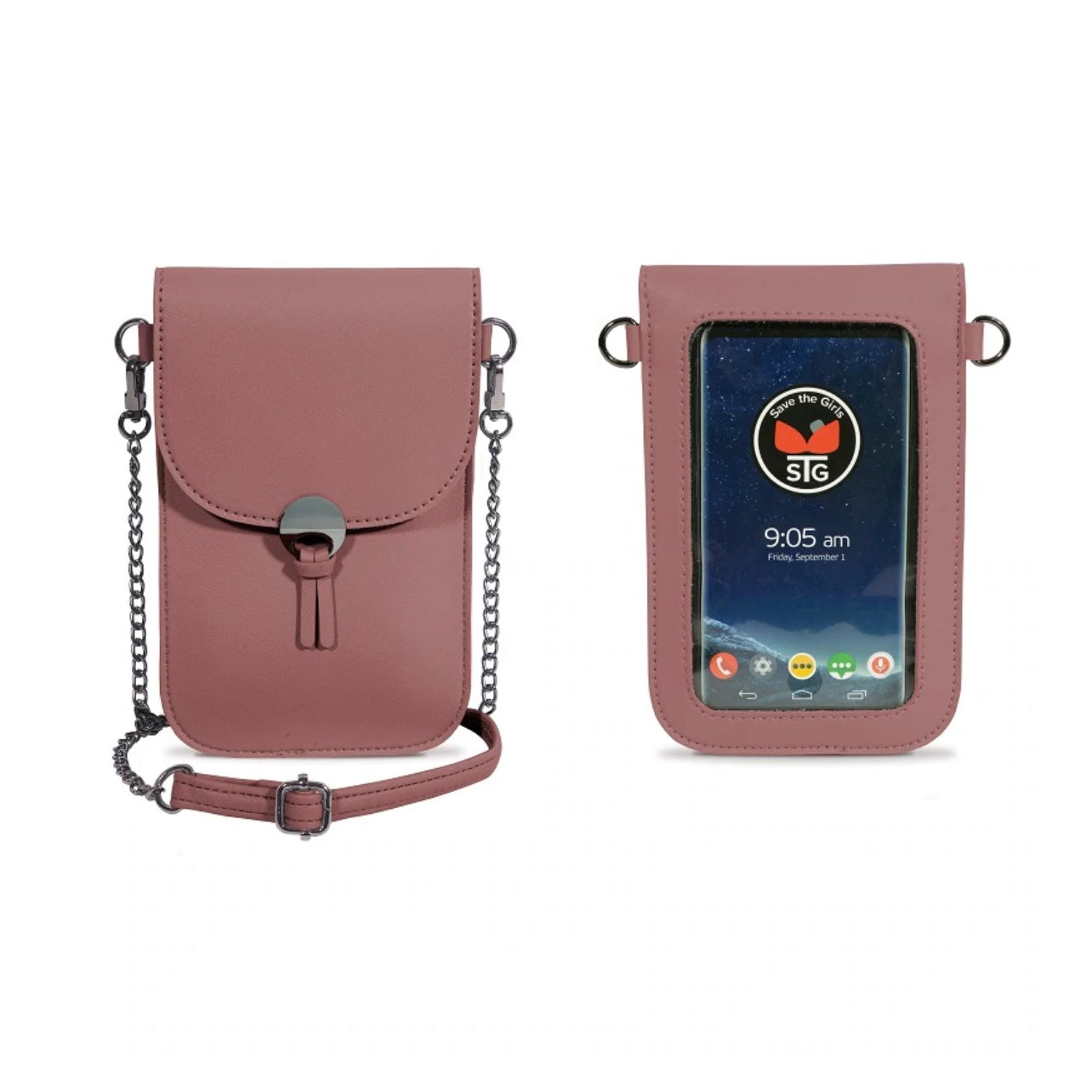 - Removable, cross-body chain shoulder strap with a short adjustable Vegan Leather shoulder comfort section