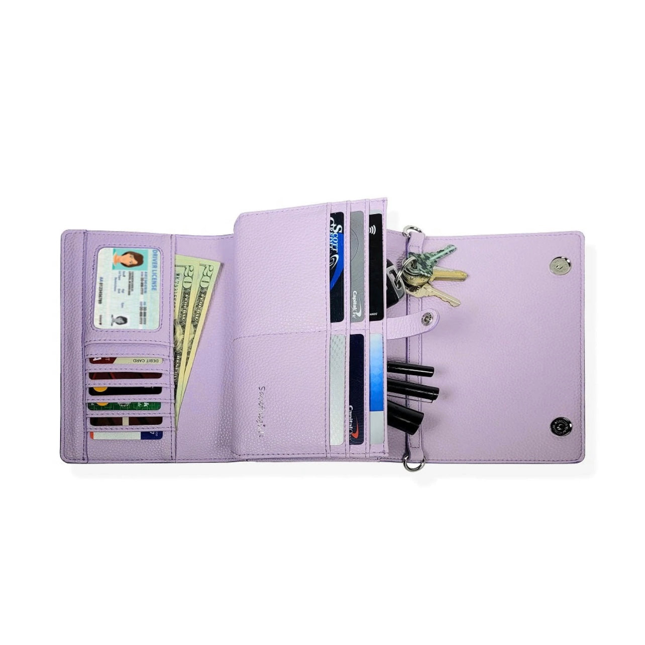 - Holds up to (12) credit cards, has a window for ID, and an inner pocket for keys and other essentials