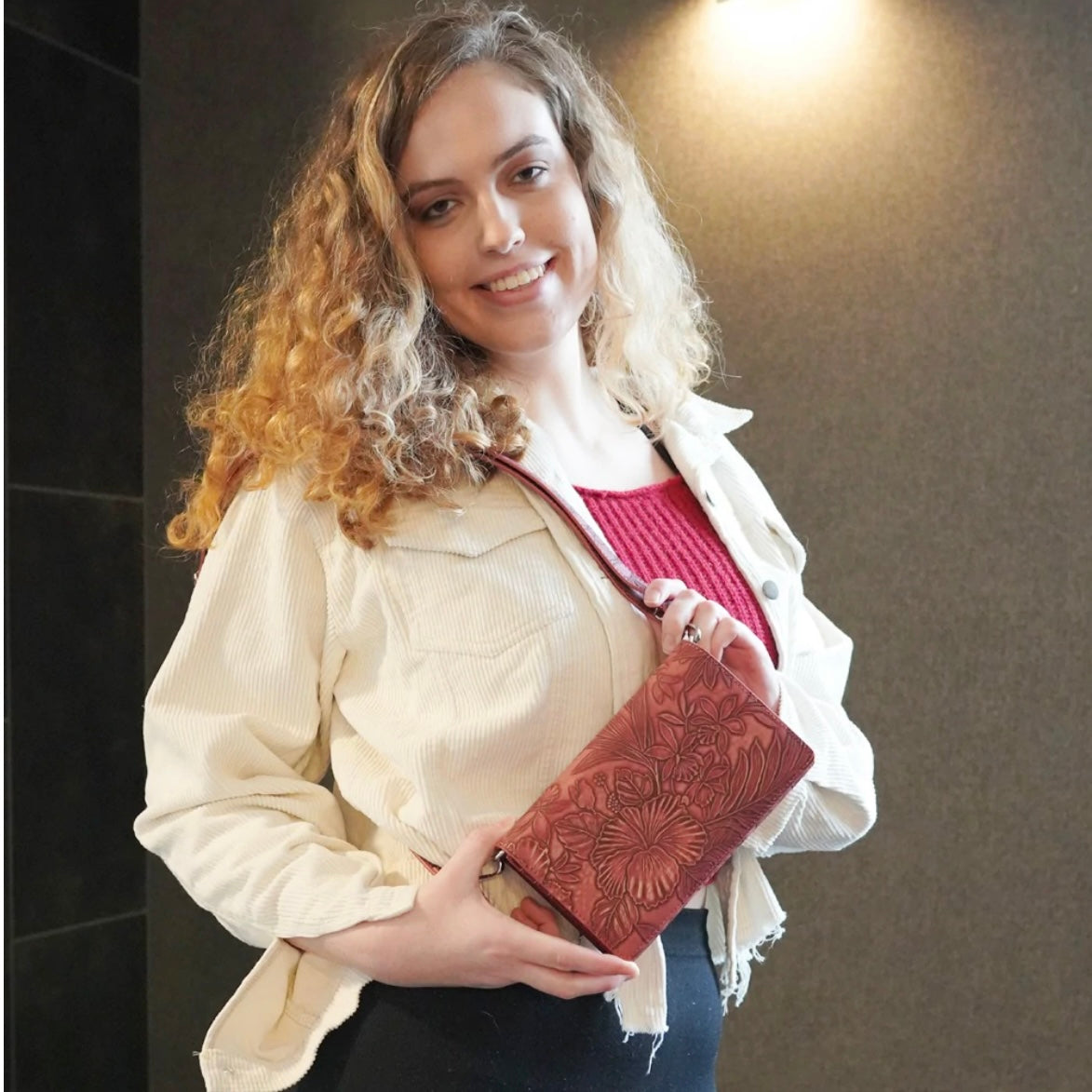 The Vistal Vail is a stunning line of purses that double as wallets. Simply remove the shoulder strap and toss it into your tote or handbag. The Vista Vail's beautiful tone-on-tone shading accentuates the embossed floral pattern, which creates a unique sculpted appearance. The interior, featuring both a well organized wallet and touch screen phone pocket, functions perfectly.